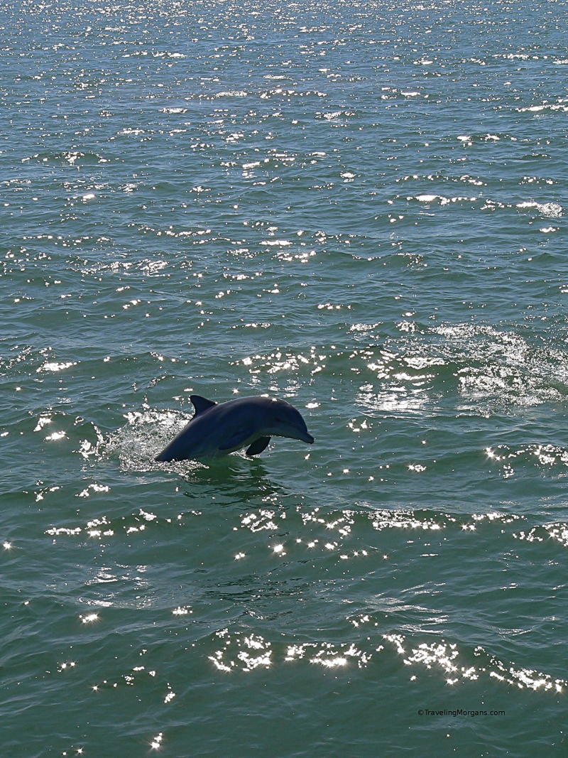Dolphin breaching just offshore at the Texas Coastal Bend from the deck of the Skimmer Boat Tour out of Rockport TX. Dolphins are also often scene from shore at Port Aransas on the gulf coast of Texas.